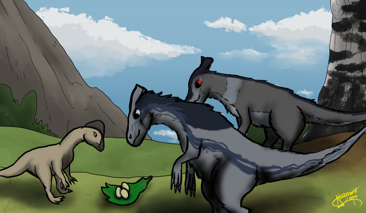 Nightingale and her half brother Zaxon, sharing eggs with an Oviraptor, Brunhilda