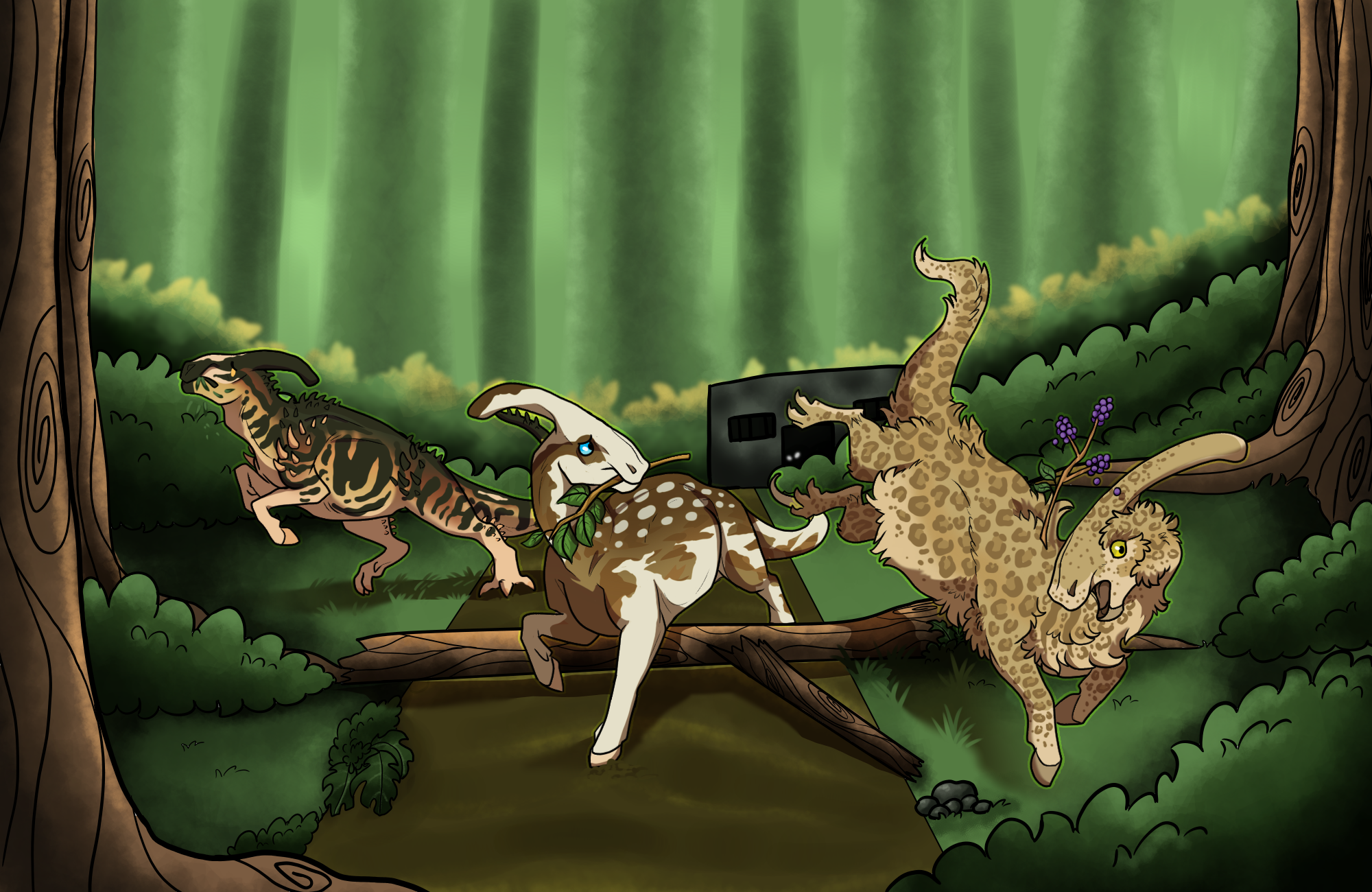 while out gathering tribute for the court, this trio of parasaurs got the fright of their life!