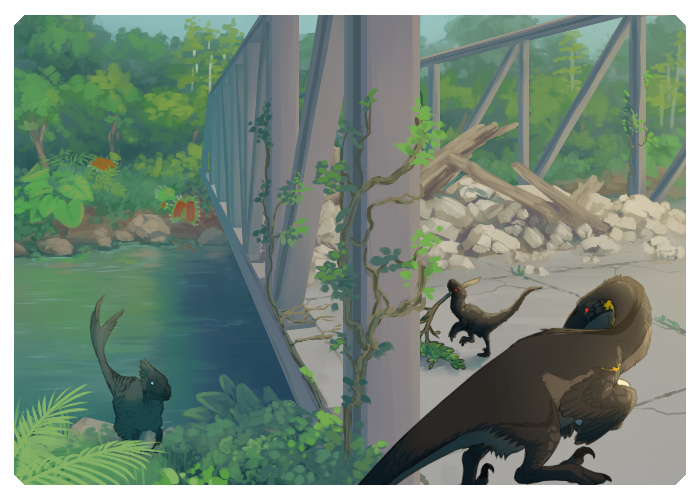 Part of digging a trench means that there are plenty of materials around to spare - and make something new with. Bagel, Toast, and Silva gather stones and debris from the riverside to add to what has already been built, blocking the bridge and at the very least slowing aggressive dinos that might try to use the bridge to reach and attack Atlantis.