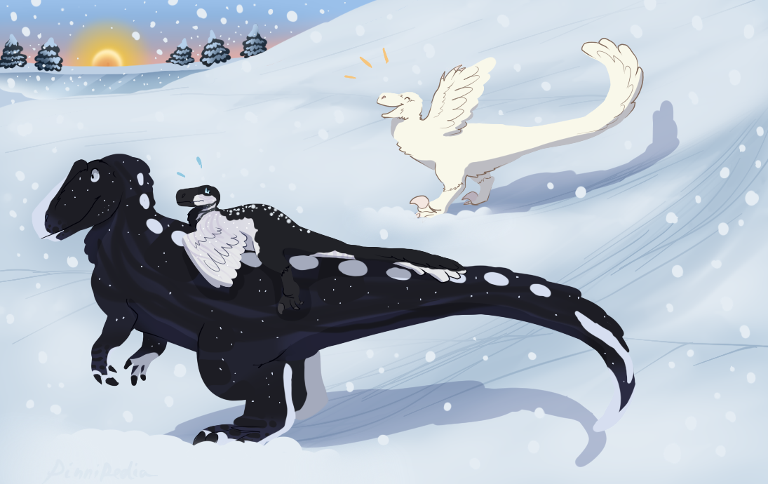 this is for the Don't Fall! seasonal. here Solaris has just slid down a big snowy mountain and is admiring the sights(that you conveniently cant see) meanwhile Pigeon hated sledding and so clung to her for protection xd Blank Space seems to enjoy the snow though, she blends right in! the sun is rising in the background, where you can see a distant frozen lake. it's snowing.