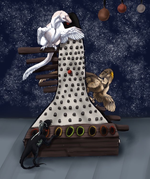 Three dinosaurs had found the cut outs of various spaceships crafted into a game board of sorts. Perhaps it was an attraction from a time when the humans roamed.
