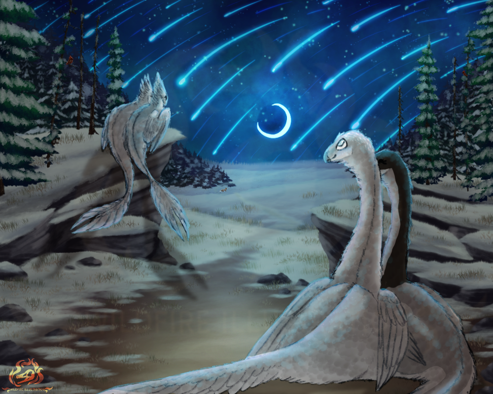 Context: Falling Stars; Saaras, Odette, Comet, and Astri watch the dazzling light show of the Geminids Meteor Shower. The spectacle of such numerous shooting stars seems like a good omen for The Children of The Night, promising a good year to come.