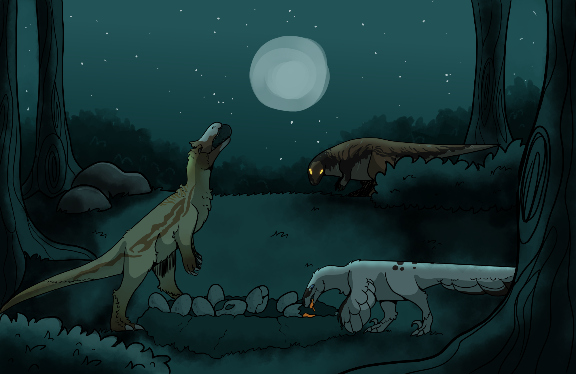 Crash and Alpine scavenge a nest of eggs, unbeknowst to them... Another predator lurks in the brush.