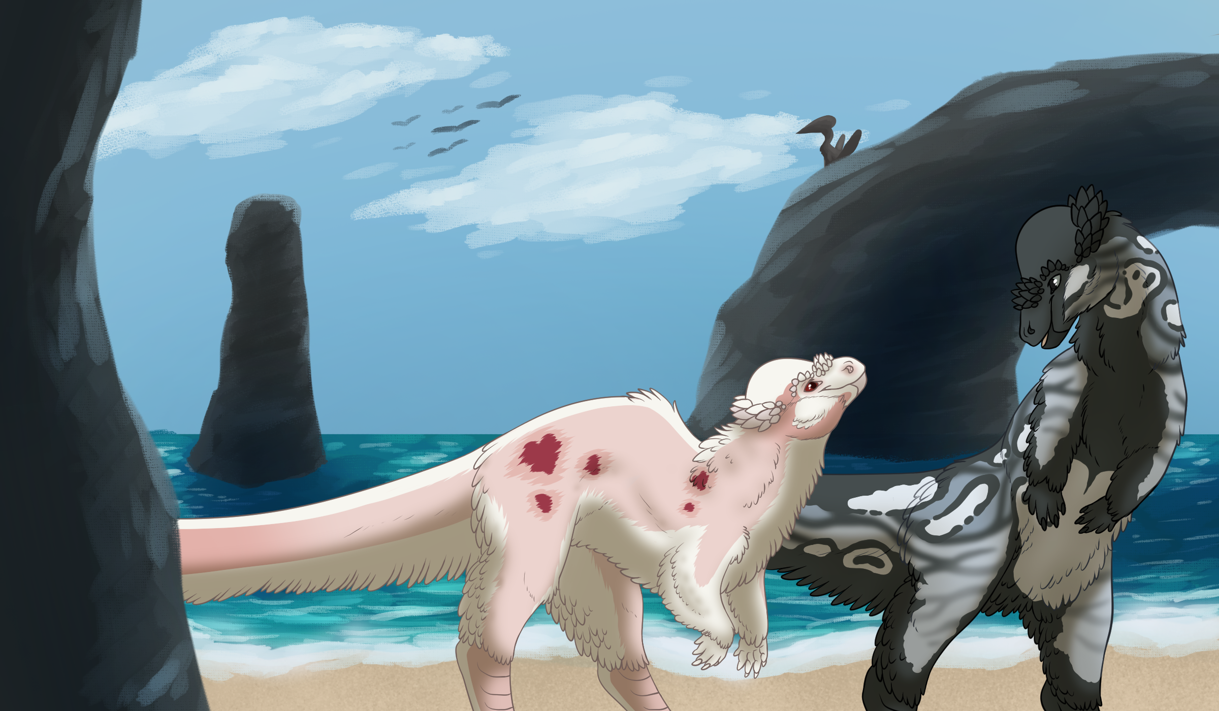 After being displaced from his home, alone and afraid of what's to come in this new place he's found himself in, a friendly face becomes a shining light in an unsure time in his life. Racing through the soft sands and seafoam, hope for a new future blossoms~