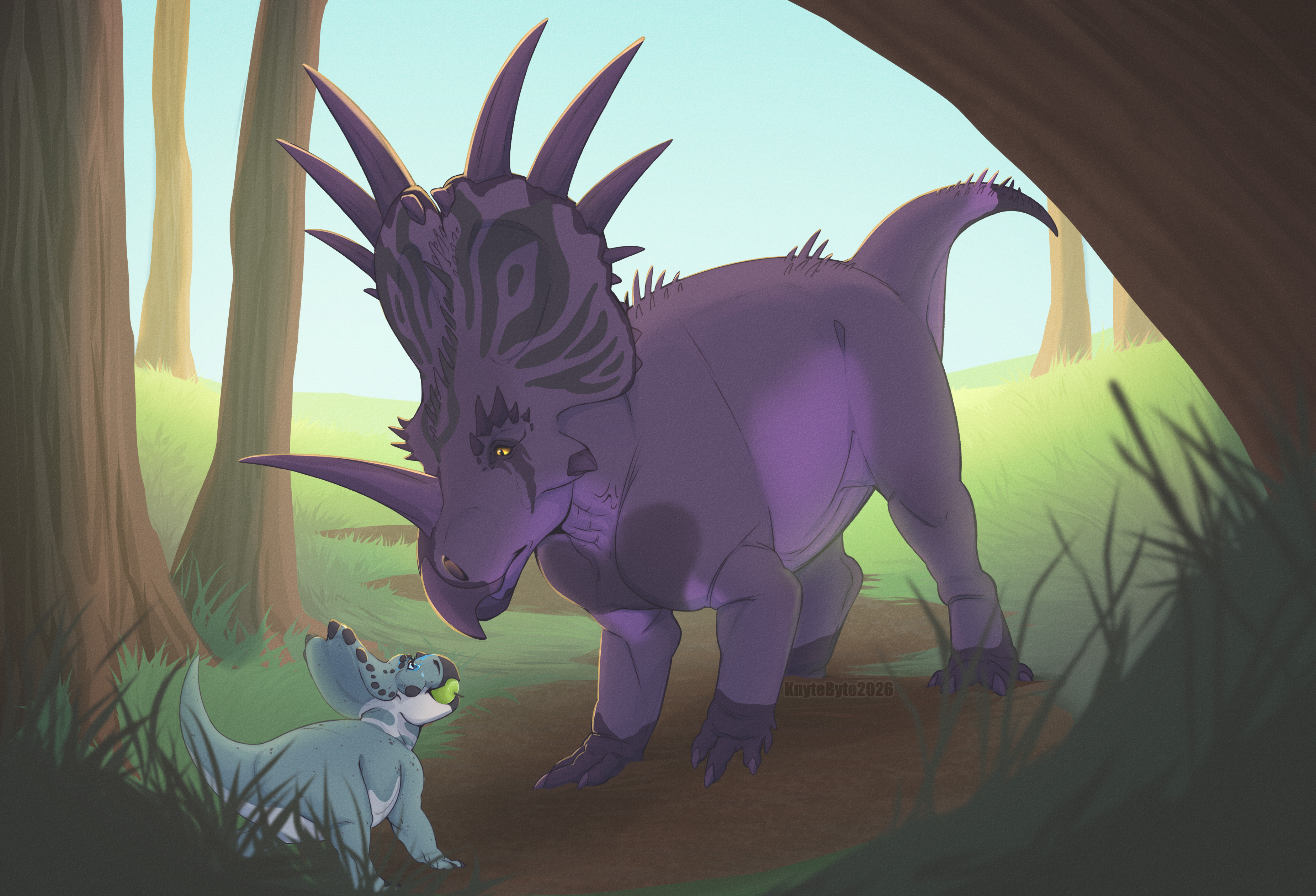 Brego had experienced a series of unfortunate circumstances in early life that left him very much alone as a hatchling. He was fortunate to be large enough to make it without his mother's guidance and protection, but it was a huge learning curve figuring out how to fend for himself and survive. He didn't have much memory of his mother or his clutch mates. Maybe a stray scent here or a brief glimpse there, but any time he tried to form an image in his mind, it fell short. The loneliness for such a young dinosaur could be crushing at times, but Brego was a particularly spirited young guy, and it never lasted for long. He was making his way, scavenging and foraging as instinct had taught him; he was making a life for himself little by little, but he wasn't out of the woods by any means. Dangers lurked behind every corner and in every shadow. A lesson he would have to learn at some point. It would either kill him or he'd become aware soon enough. Fortunately, for Brego, the first time he came across another living dinosaur, it happened to be another Styracosaurus. A large bull, that stared down at the stray youngster with kind eyes. He could see the strength and power in such a large adult. Awe-struck and full of joy to finally not be alone, Brego, in all of his inexperience, ran right up to the stranger, apple still in his mouth. Fortunately for him again, the bull was compassionate and greeted him kindly. While Brego was not outright adopted, he was given a lesson on survival. Something he sorely needed if he was gonna continue to make it on his own. A warning of caution that he took very much to heart. We can't say for sure if the talk is the exact reason Brego continued to survive, but it certainly helped, and the entire experience had offered the youngster a whole lot of hope for his own future. He couldn't wait to become big and strong, like the kind stranger who offered him guidance.
